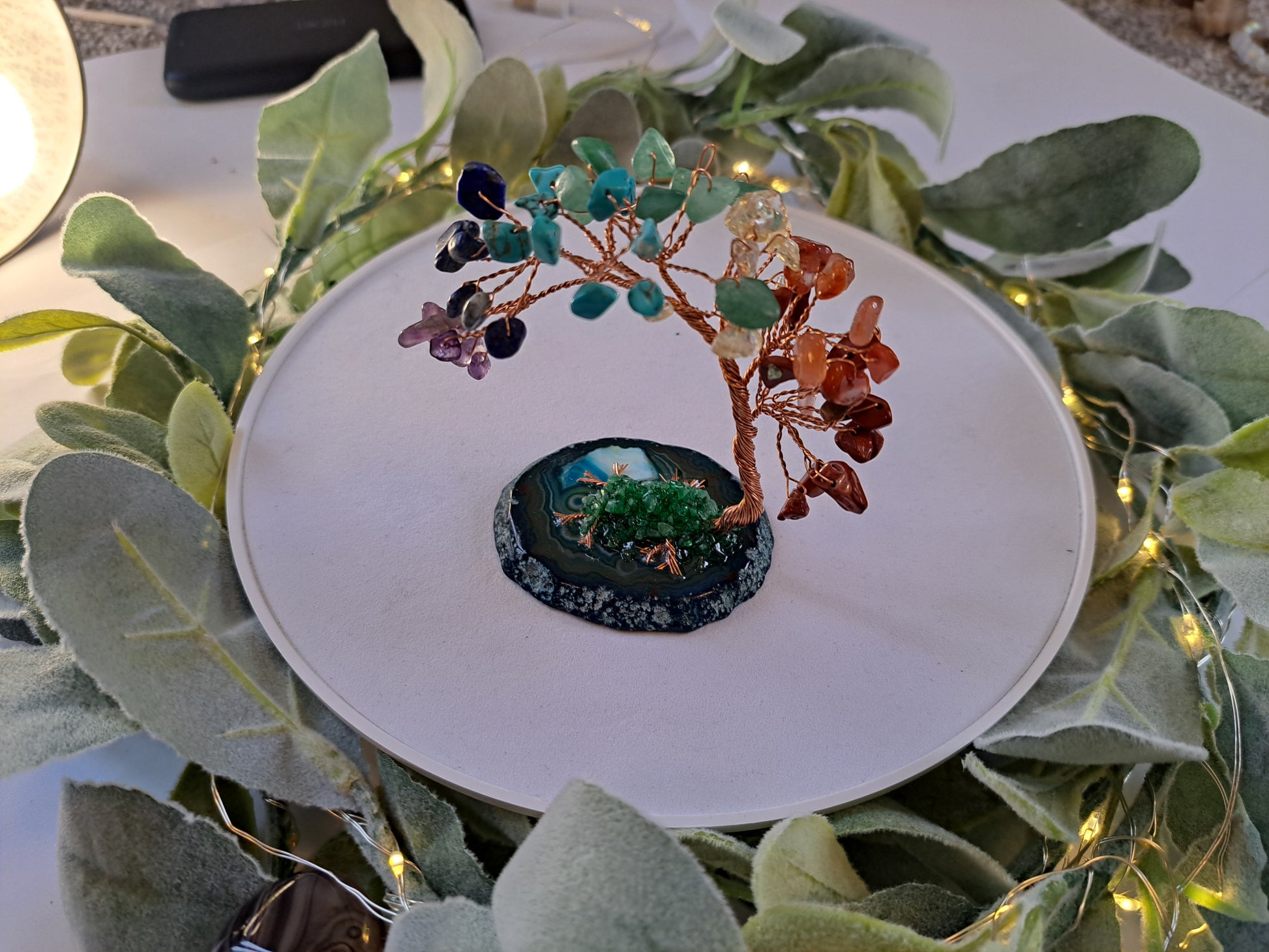 Beautiful chakra crystal bonsai style tree, featuring agate base and green aventurine stones, lovely home decor item symbolizing wealth and prosperity
